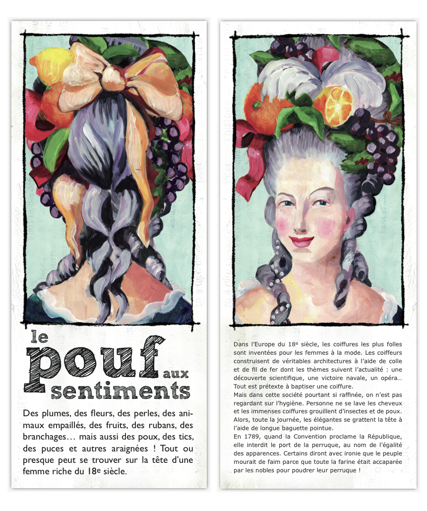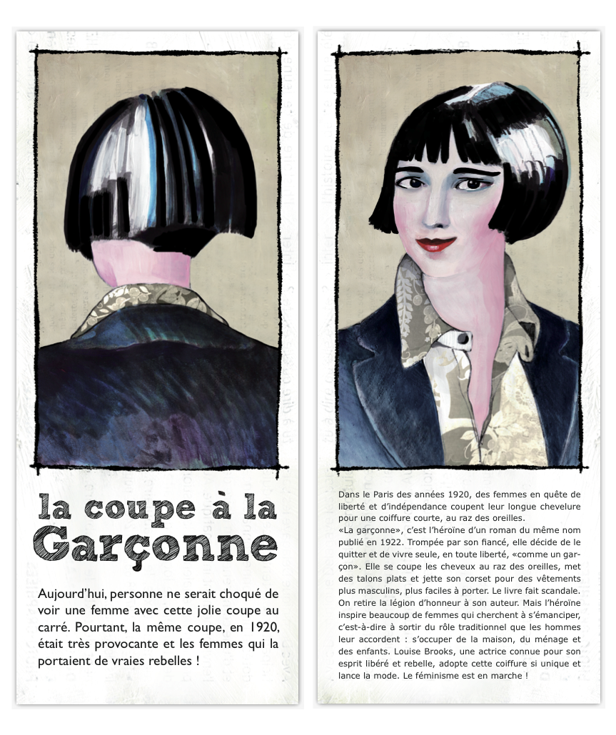 Le projet s’adresse à un public de 12 ans et plus. Il prend la forme d’un jeu de grandes cartes à manipuler. Chaque carte présente un portrait de dos et de face. Au recto, le nom de la coiffure et une phrase introductive invitent le lecteur à en savoir plus. Au verso, la coiffure est placée dans son contexte historique afin de décrire l’époque dans laquelle elle s’inscrit.