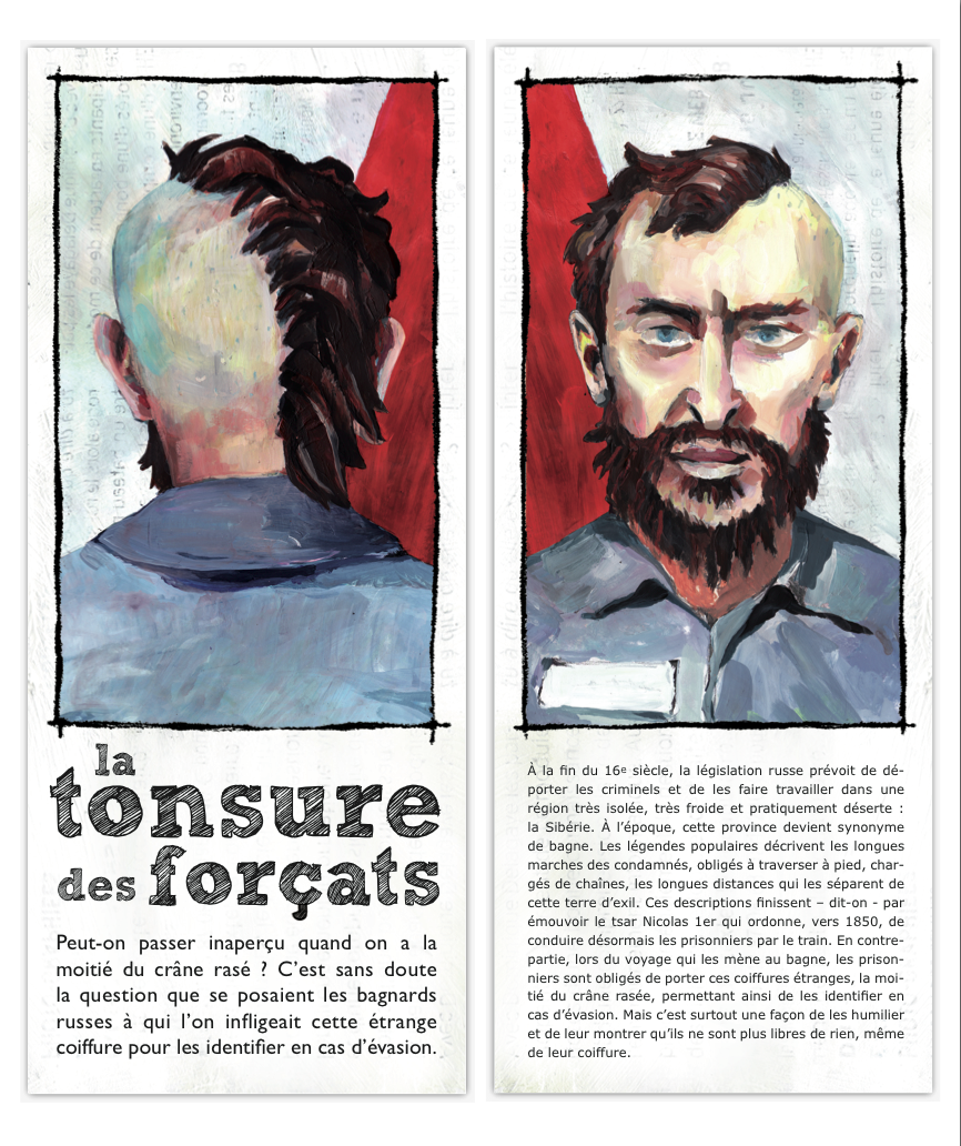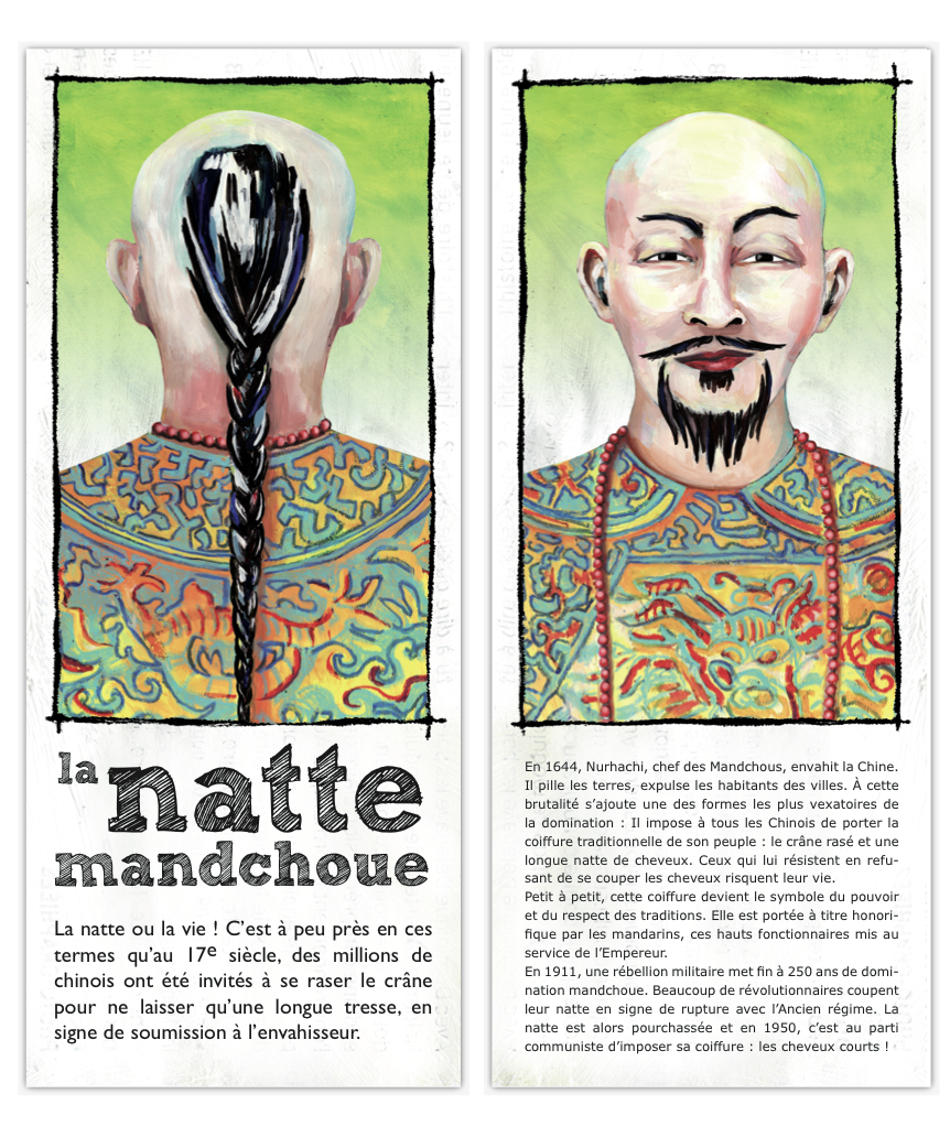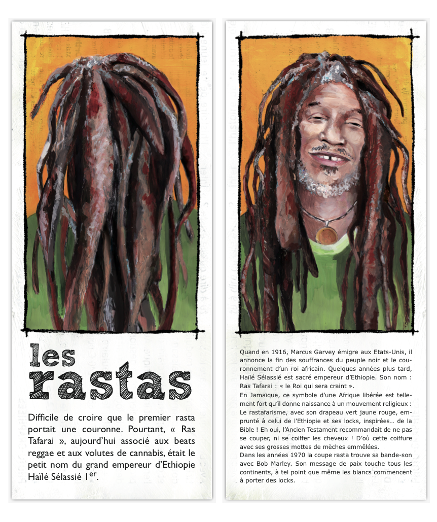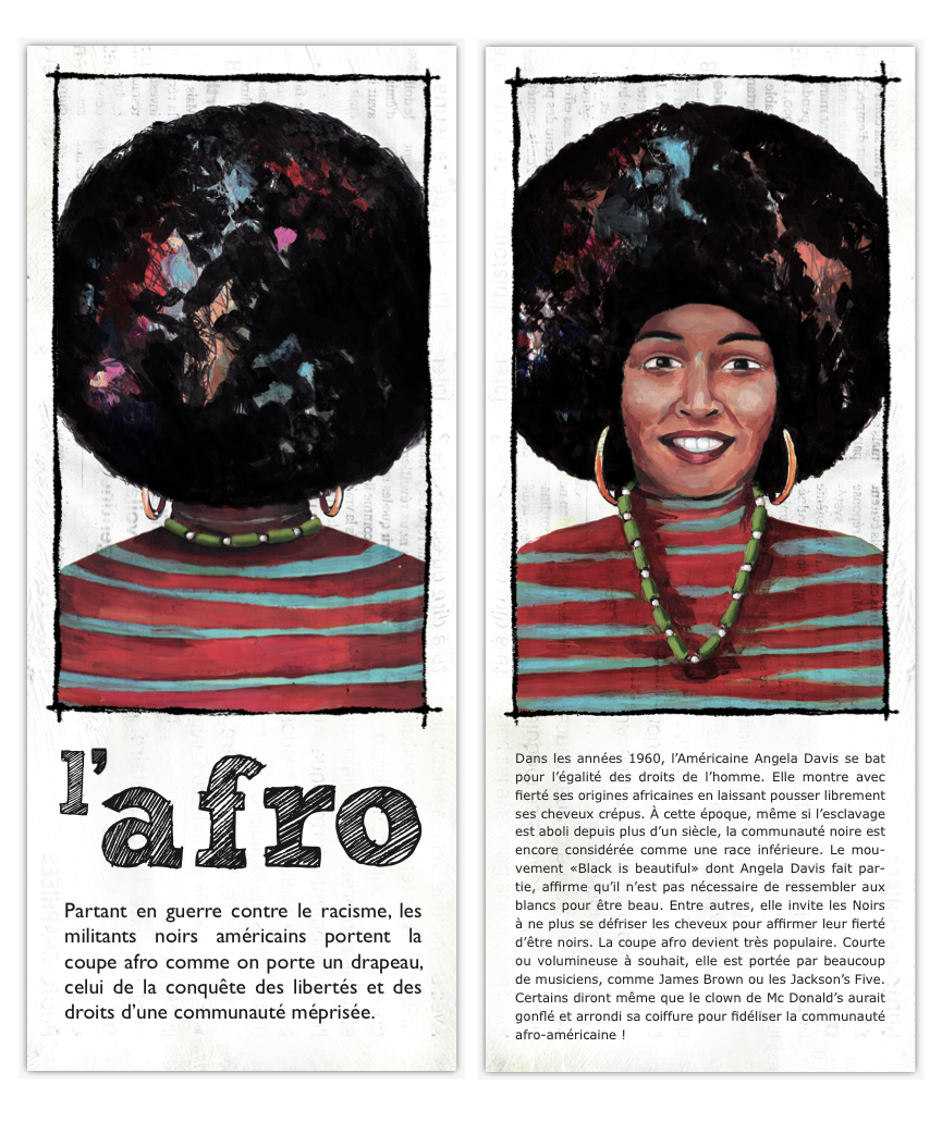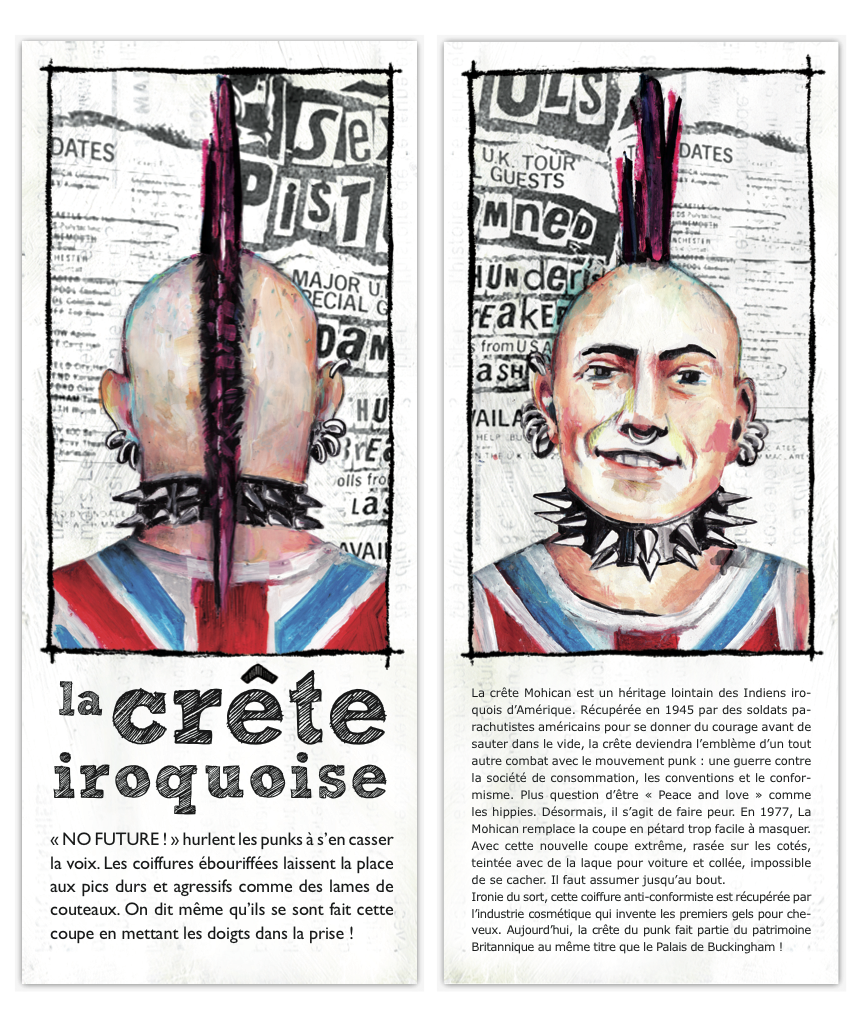 Le système de cartes permet de bousculer la chronologie, de comparer les coupes et de provoquer des rencontres improbables : philosophes Cyniques de l’Antiquité grecque et hippies, punks et guerriers Mohawks, Jeanne d’Arc et les «Garçonnes» du début du 20e siècle… Une véritable fresque historique vue à travers les coiffures !