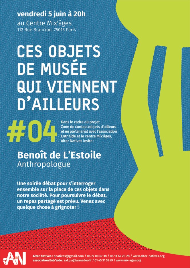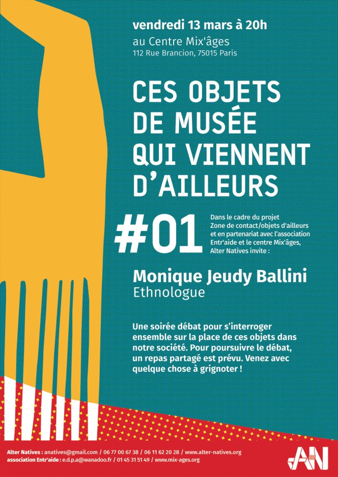 - Réalisation d’une affiche et de 12 déclinaisons pour le cycle de conférences « Ces objets de musées qui viennent d’ailleurs » organisé par l’association