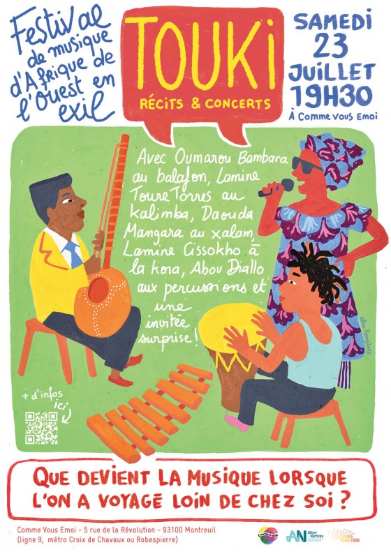 Affiche pour la première édition du festival des musicien·nes en exil Touki à Montreuil – été 2022